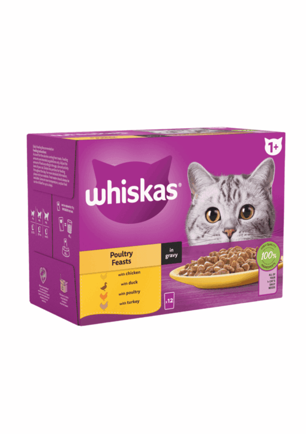 Delight your cat with the irresistible taste and nutrition of WHISKAS 1+ Poultry Feasts in Gravy — a wholesome, balanced meal that supports strength, vitality, and lifelong health, one pouch at a time.